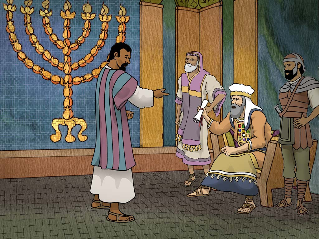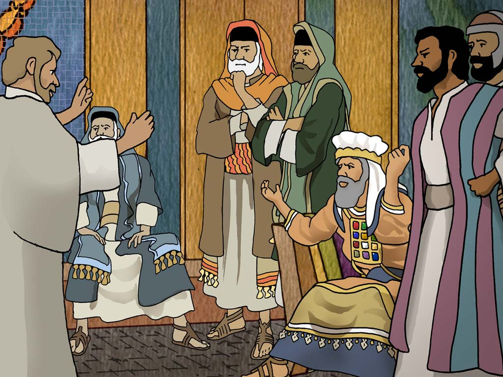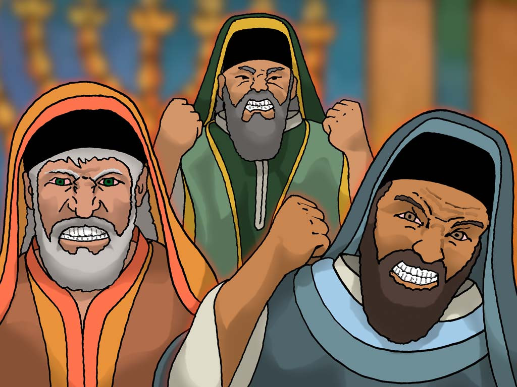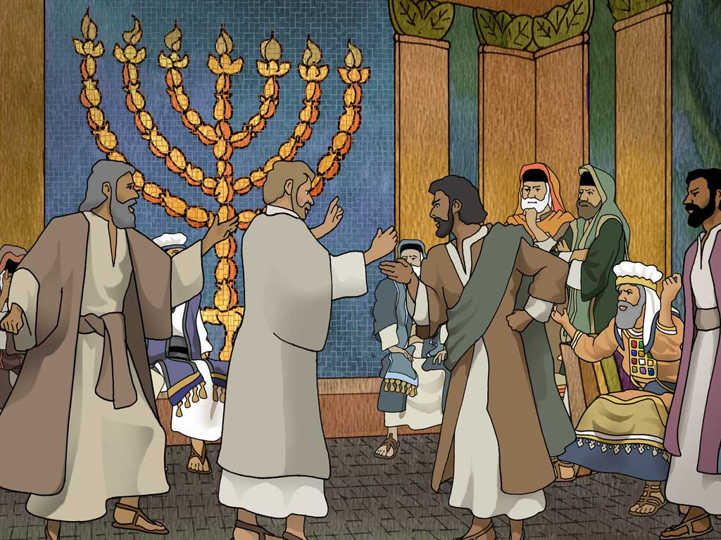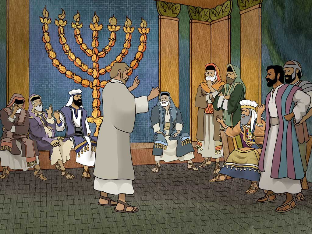 Zazdrośni mężczyźni postawili Szczepana przed sądem. Powołali fałszywych świadków, którzy mówili: Ten człowiek nieustannie wypowiada się przeciwko temu świętemu miejscu i Prawu; słyszeliśmy bowiem, jak mówił, że ten Nazarejczyk, Jezus, zniszczy to miejsce i zmieni zwyczaje, które przekazał nam Mojżesz. (Dzieje Apostolskie 6:13–14) – Slajd 1