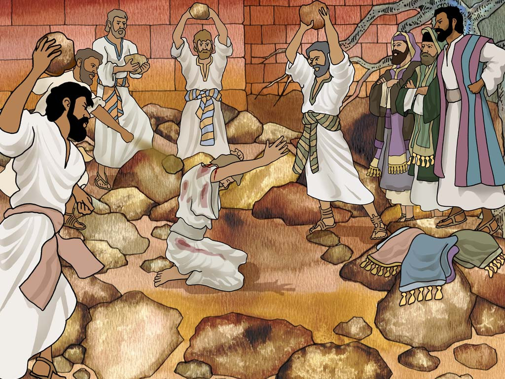 Wtedy wygnali go z miasta, zaczęli go kamienować, a świadkowie złożyli swoje szaty u stóp młodego mężczyzny imieniem Saul. Kontynuowali kamienowanie Szczepana, który wzywał Pana i mówił: Panie Jezu, przyjmij mojego ducha! Następnie upadł na kolana i głośno zawołał: Panie, nie poczytaj im tego grzechu! Po tych słowach stracił świadomość. (Dzieje Apostolskie 7:58–60) – Slajd 6