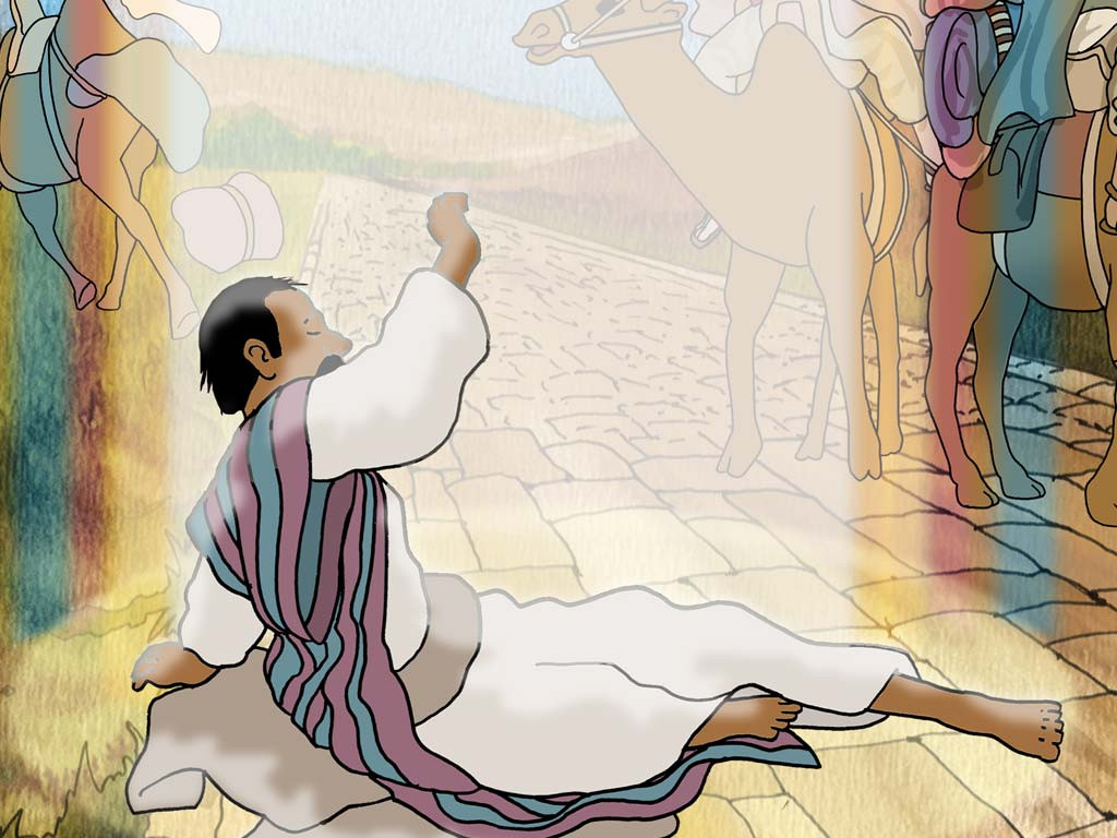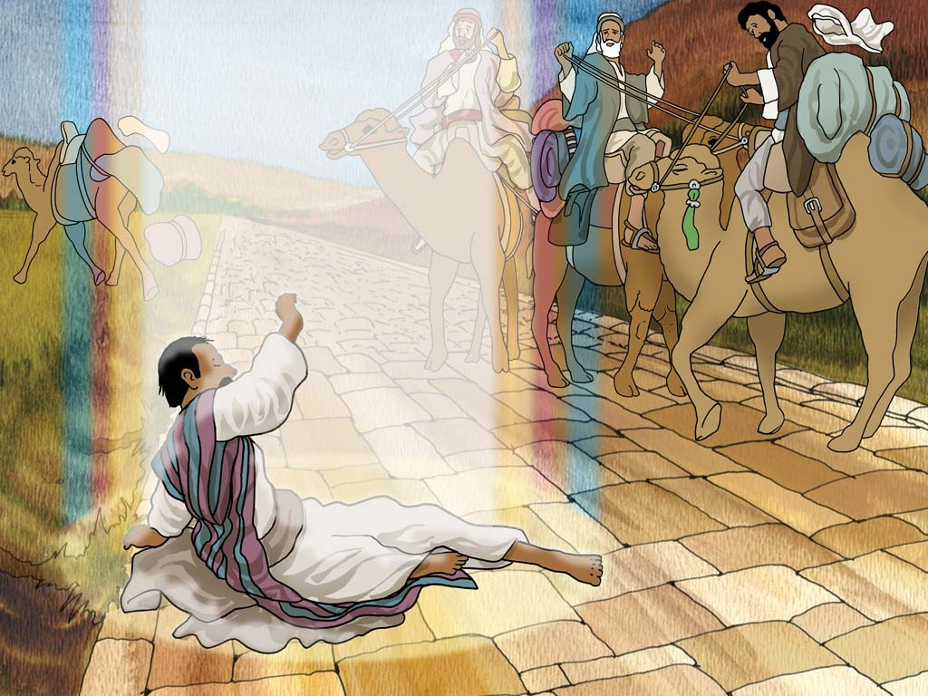 Podczas podróży zbliżał się do Damaszku, gdy nagle otoczyła go jasność z nieba. Upadł na ziemię i usłyszał głos, który mówił do niego: Saulu, Saulu, dlaczego mnie prześladujesz? (Dzieje Apostolskie 9:3–4) – Slajd 9