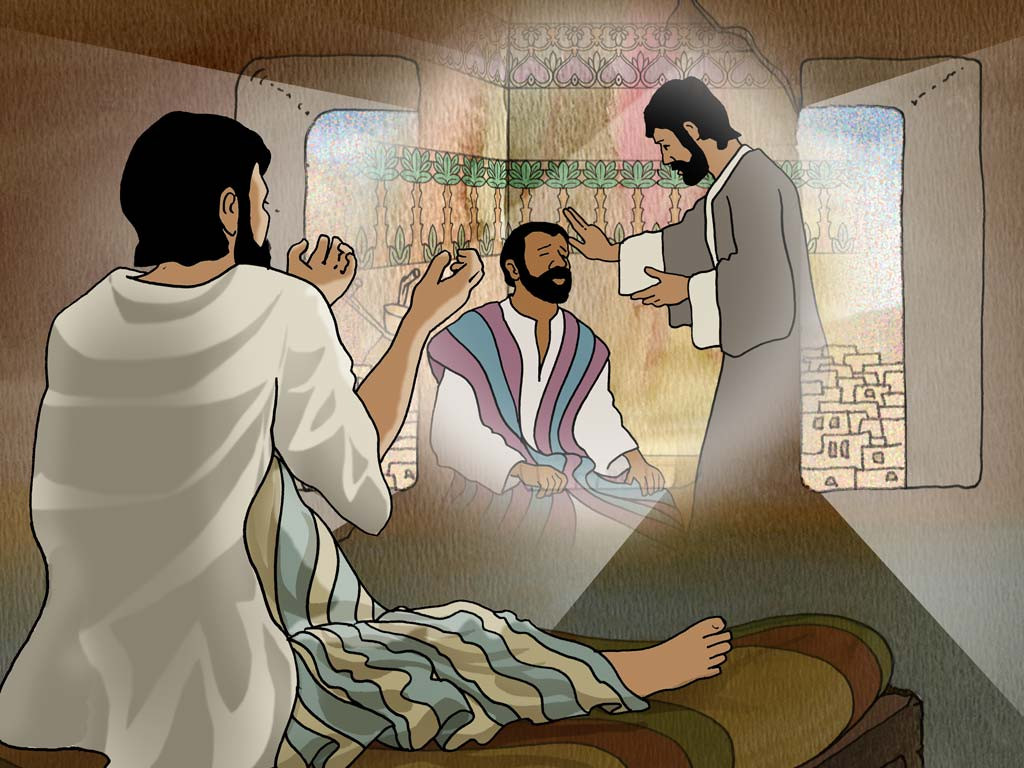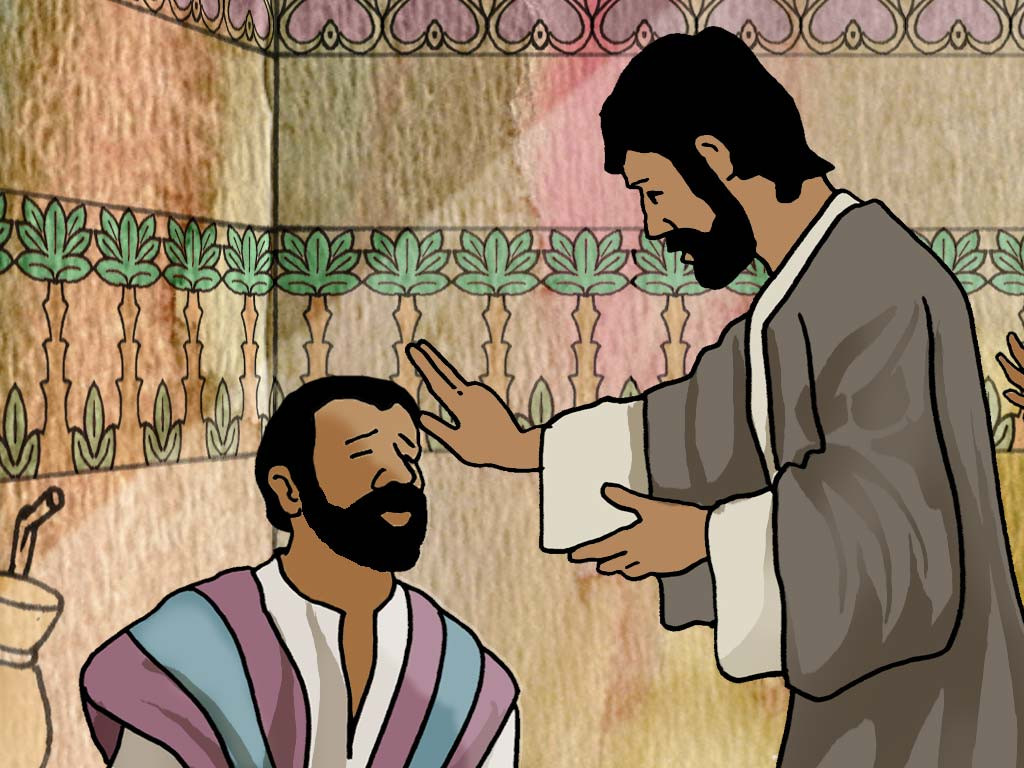 Ananiasz więc wyszedł i wszedł do domu, a położywszy na niego ręce, rzekł: Bracie Saulu, Pan Jezus, który ukazał ci się na drodze, którą przybyłeś, posłał mnie, abyś odzyskał wzrok i został napełniony Duchem Świętym. (Dzieje Apostolskie 9:17) – Slajd 16