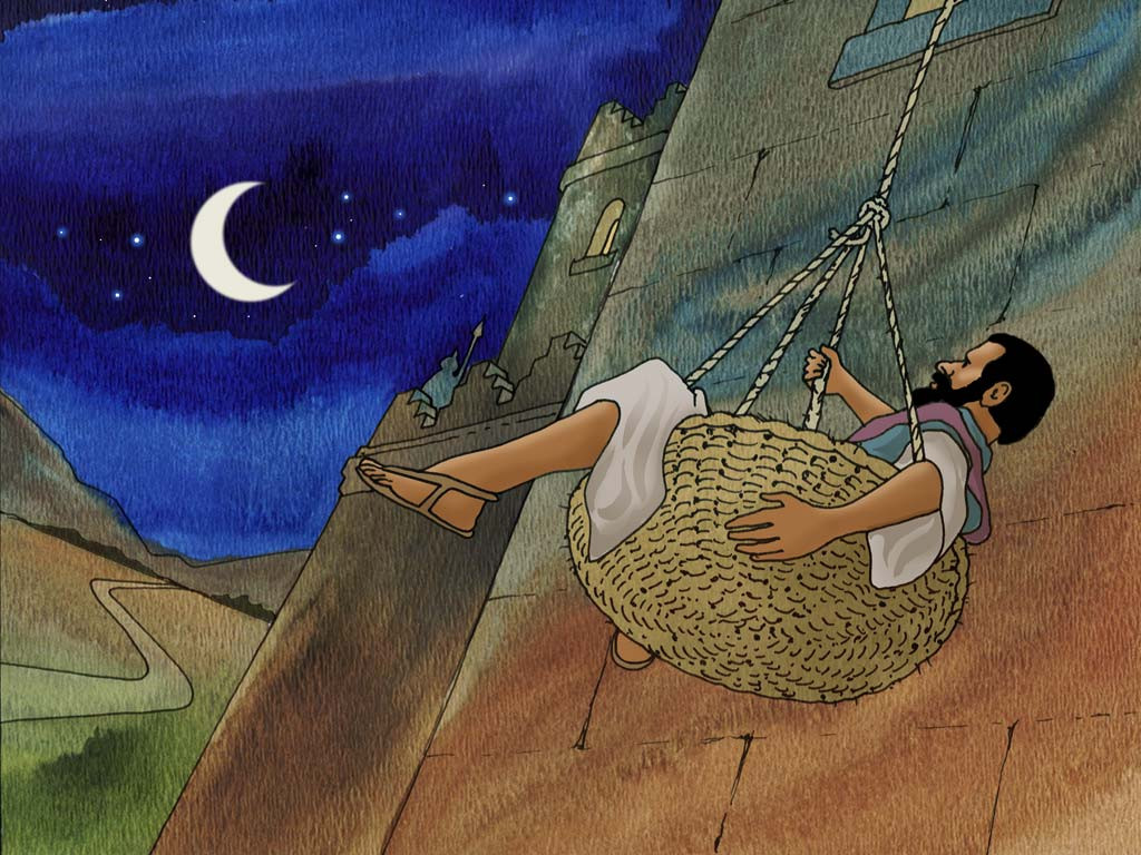 ...ale jego uczniowie zabrali go nocą i spuścili przez otwór w murze, opuszczając go w dużym koszu. (Dzieje Apostolskie 9:25) – Slajd 20